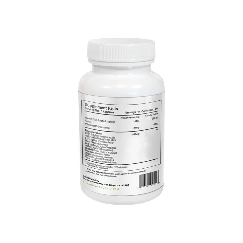 Contains: Vitamin E, Calcium EDTA, Ginkgo Biloba, Gotu Kola, Horse Chestnut, Butchers Broom, Witch Hazel, Odorless super garlic, Cayenne Pepper, Niacin (flush free Niacin), Grape seed extract, Citrus flavonoids